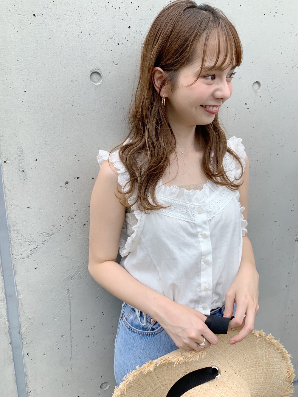 白コットンレーストップスに、デニムと麦わら帽子が定番にかわいいスタイル♡ 重ね着との相性も抜群な丈の短めなレーストップス!かわいい♡ flower PRESS Yagi Instagram @flower_yagi