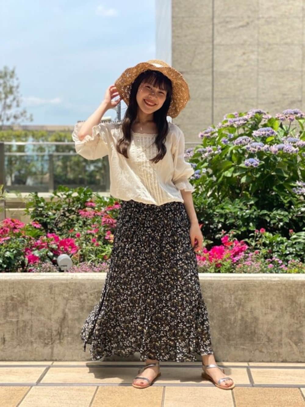夏に着たい、大人ガーリーなスタイリング♡ 甘めのブラウスはblackを合わせれば、落ち着いた印象に。 日除けのリボンハットも欠かさずにプラスして♪ ルクア店 masuyama instagram→@flower_lucua