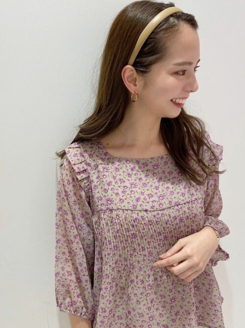 小さな肩のフリルと小花柄が大人可愛いブラウス♡ デザイン性のあるトップスは、 カチューシャでまとめたすっきりヘアが◎ PRESS yagi instagram→@flower_yagi