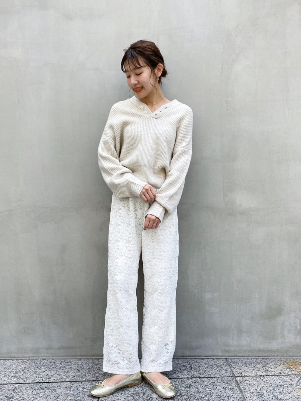 ホワイトコーデ♥ クリームカラーのような抜け感のあるニットに、ホワイトのレースパンツ♡ ゴールドのバレエシューズもポイントに! flower 新宿店staff taira Instagram @flower_taira
