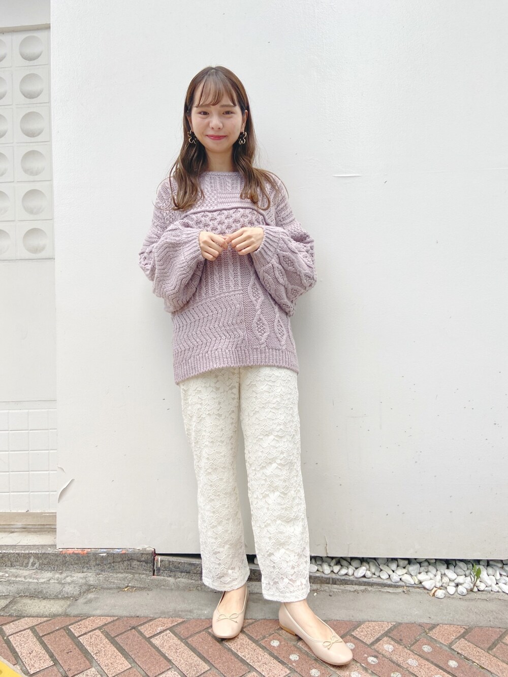 ゆったりサイズのニットには、 すっきりしたボトムスを合わせるのが◎ レースパンツで大人可愛いスタイルにしました♡ PRESS yagi instagram→@flower_sakamoto