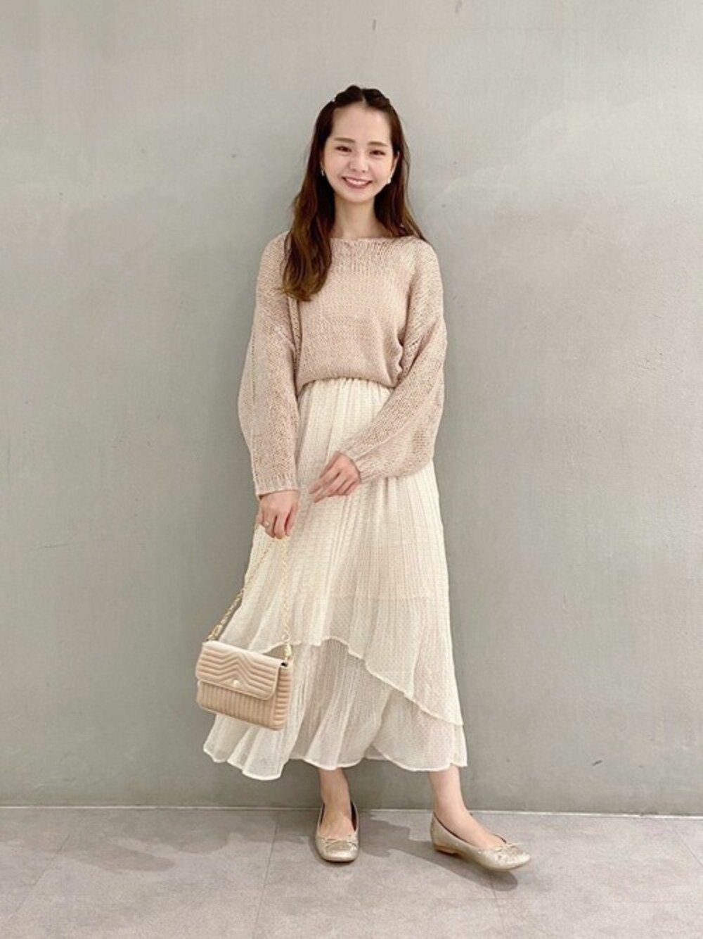 ニュアンスカラーでまとめた 女性らしさたっぷりのコーディネート♡ 透かし編みニットは、ショート丈なので 着回し力も抜群です! PRESS yagi instagram:@flower_yagi