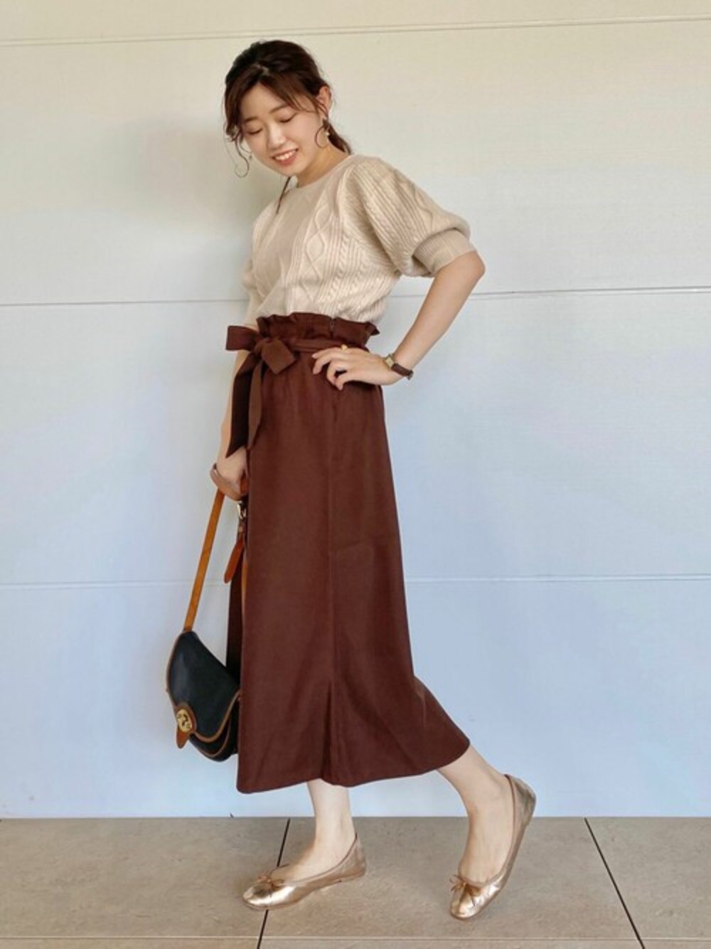 秋ならではのブラウンスカート♡ 半袖ニットを併せて大人可愛いスタイリングに・・♪ 横浜店 funahashi instagram:@flower_funahashi
