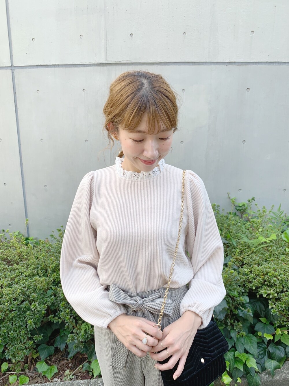 首元のフリルがフェミニンなトップスは チェック柄パンツを合わせて秋らしいスタイルに♡ PR staff sakamoto instagram:@flower_sakamoto