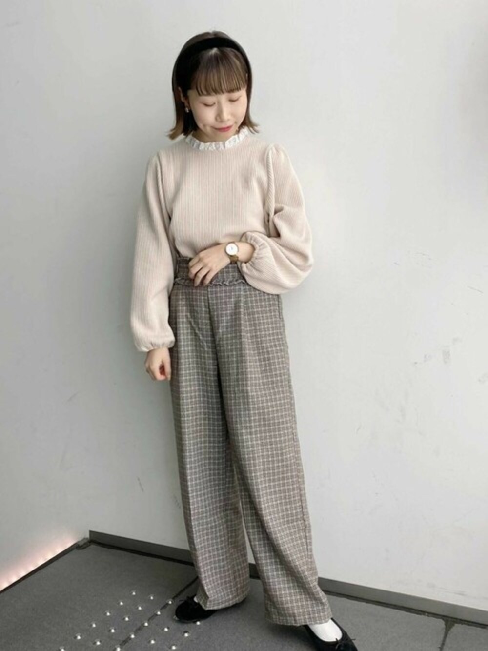 首回りのレースが可愛いトップス♡ チェック柄パンツを合わせて秋にぴったりのスタイルに・・! 小物がブラックでまとめるのが◎ 堀江店 utsumi instagram:@flower_utsumi