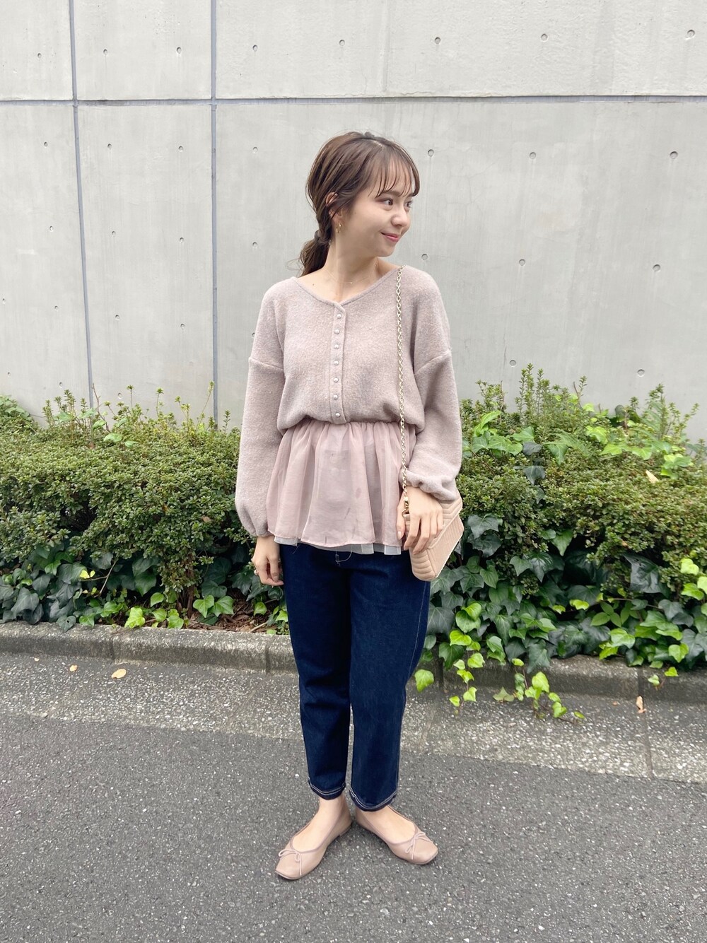 ペプラムのトップスにベージュカラーで合わせて♡ シフォン素材のフリルがキュートな1枚♩ flower PRESS yagi Instagram @flower_yagi