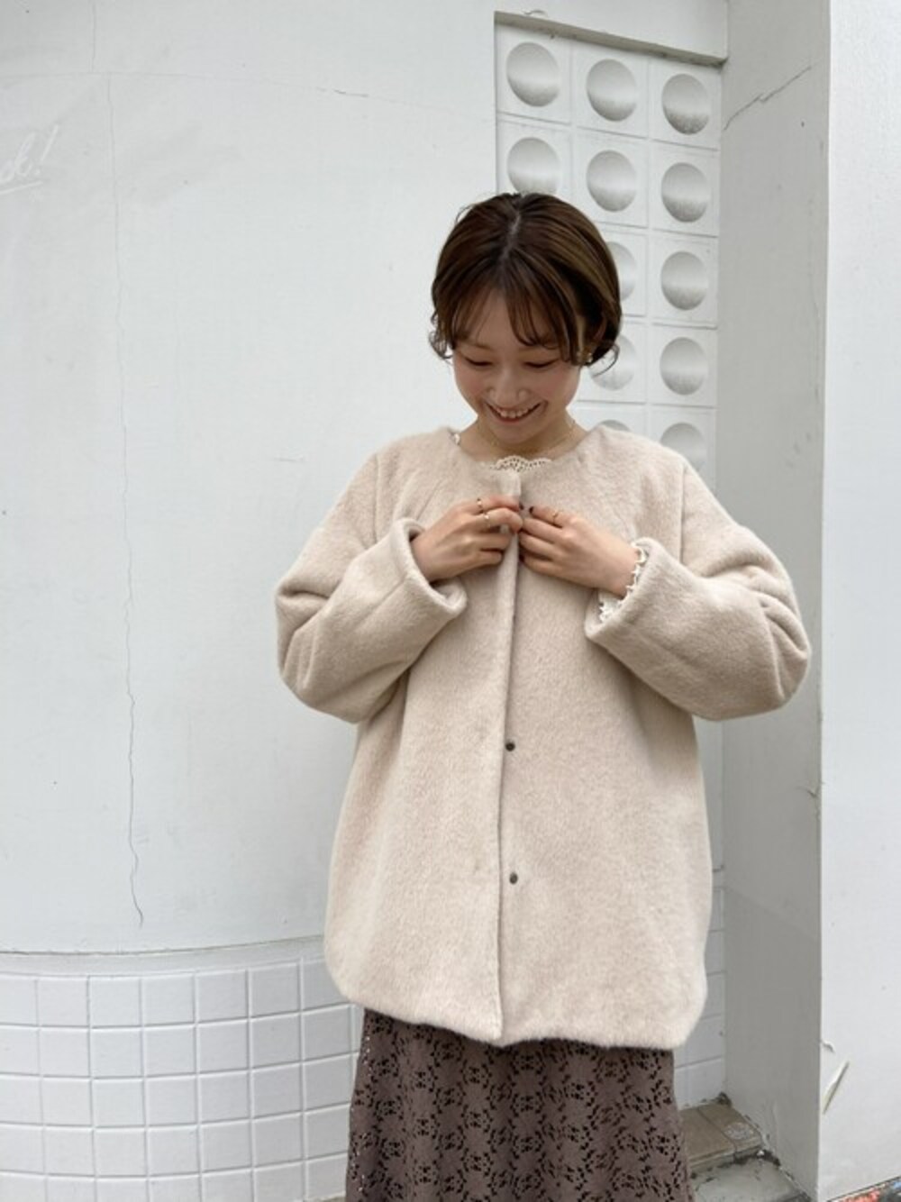 首の開き具合がきれいに見えるコートにレーススカートを合わせて♡ ゴールドのアクセサリーが女性らしさを引き立ててくれる。 flower 池袋staff yoshida Instagram @flower_yoshida