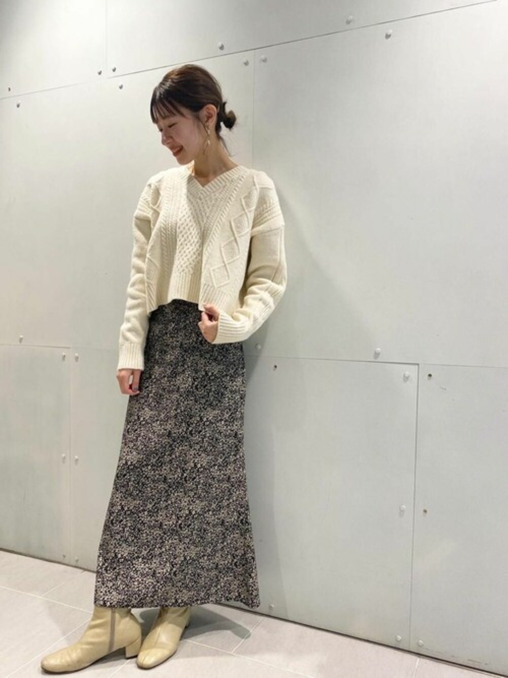ショート丈アランニットは、マーメイドシルエットスカートを合わせてスタイリング♪ ほっこりしないバランスが大人可愛くて◎ 新宿店 taira instagram:@flower_taira