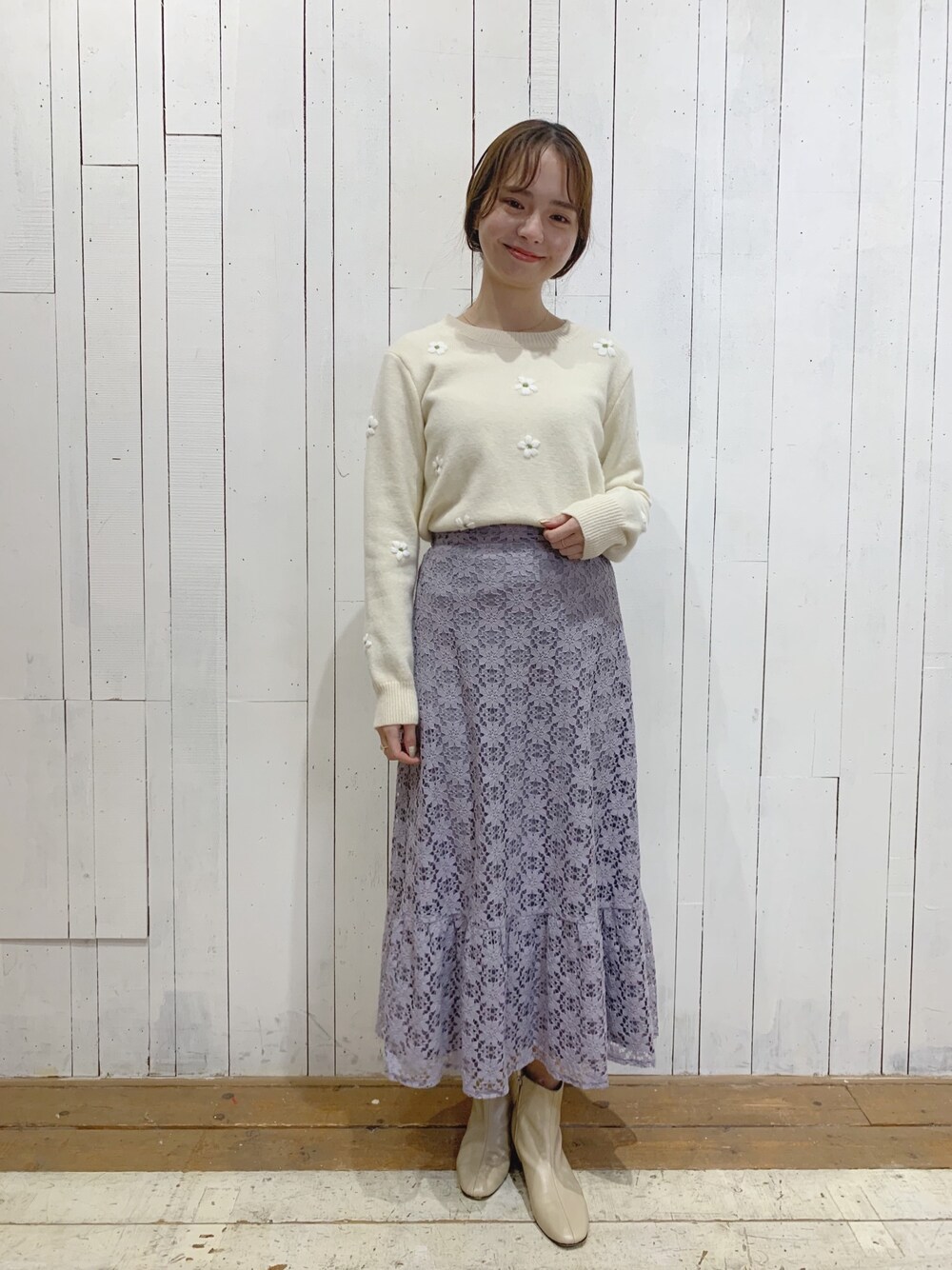 ティアードデザインのレーススカートは お花の刺繍が施されたニットでとことんフェミニンに♪ PRESS yagi instagram:@flower_yagi