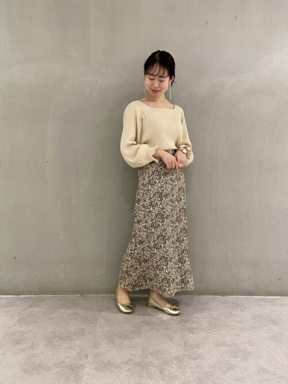 ベージュをベースカラーにまとめたコーデ♡ ゴールドのパンプスとアクセで女性らしく♩アップなヘアスタイルにすることもポイント♩ flower 池袋staff yasuda Instagram @flower_yasuda