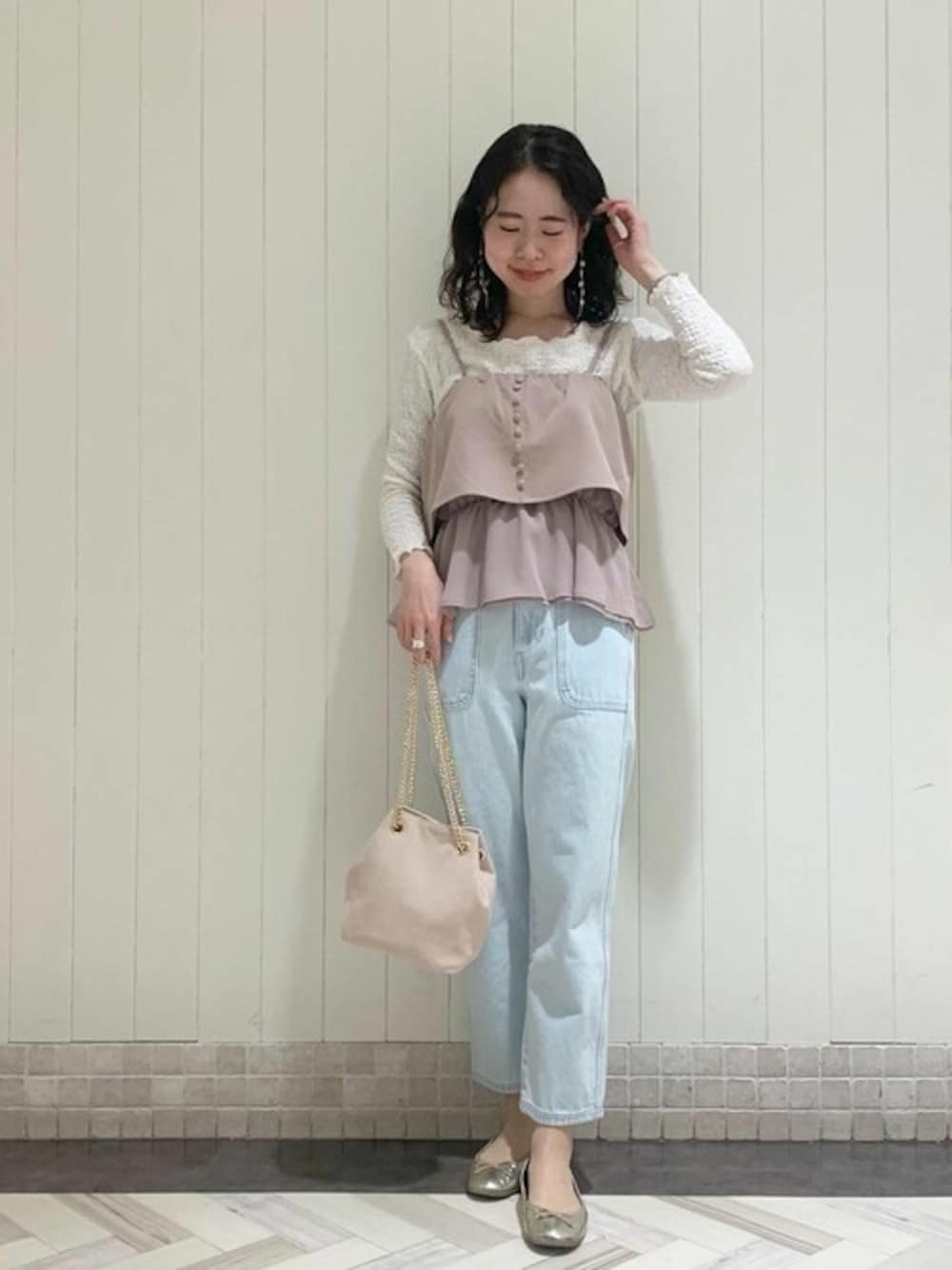 新作アイテムのコーディネート♩ テーパードシルエットとハイウエストデザインでスタイルアップ効果抜群のデニムと フレアのゆるっとしたデザインが春らしいキャミソールを合わせました♡ flower池袋店staff yasuda instagram : @flower_yasuda