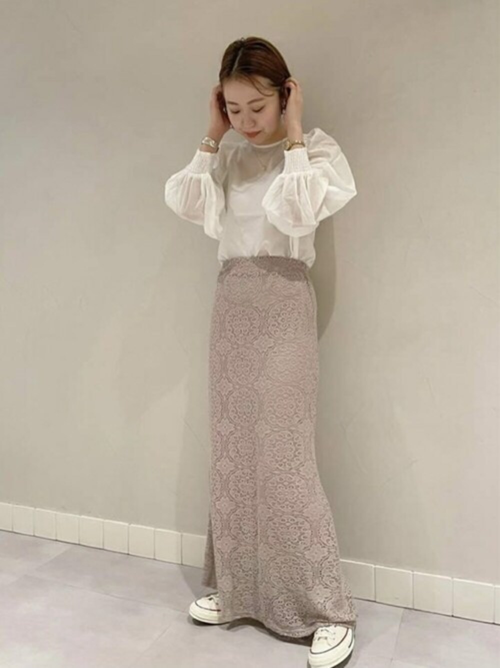 繊細なクロシェレースを使用したマーメイドスカート 大判な編み柄とすっきりしたシルエットが大人かわいい印象に♡ flower池袋店staff takushima instagram : @flower_takushima