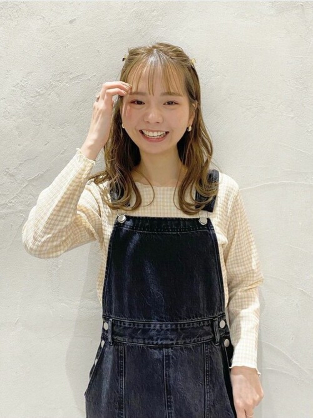 ギンガムチェックのトップスにサロペットを合わせて キュートなスタイルに♡ PRESS yagi instagram : @flower_yagi