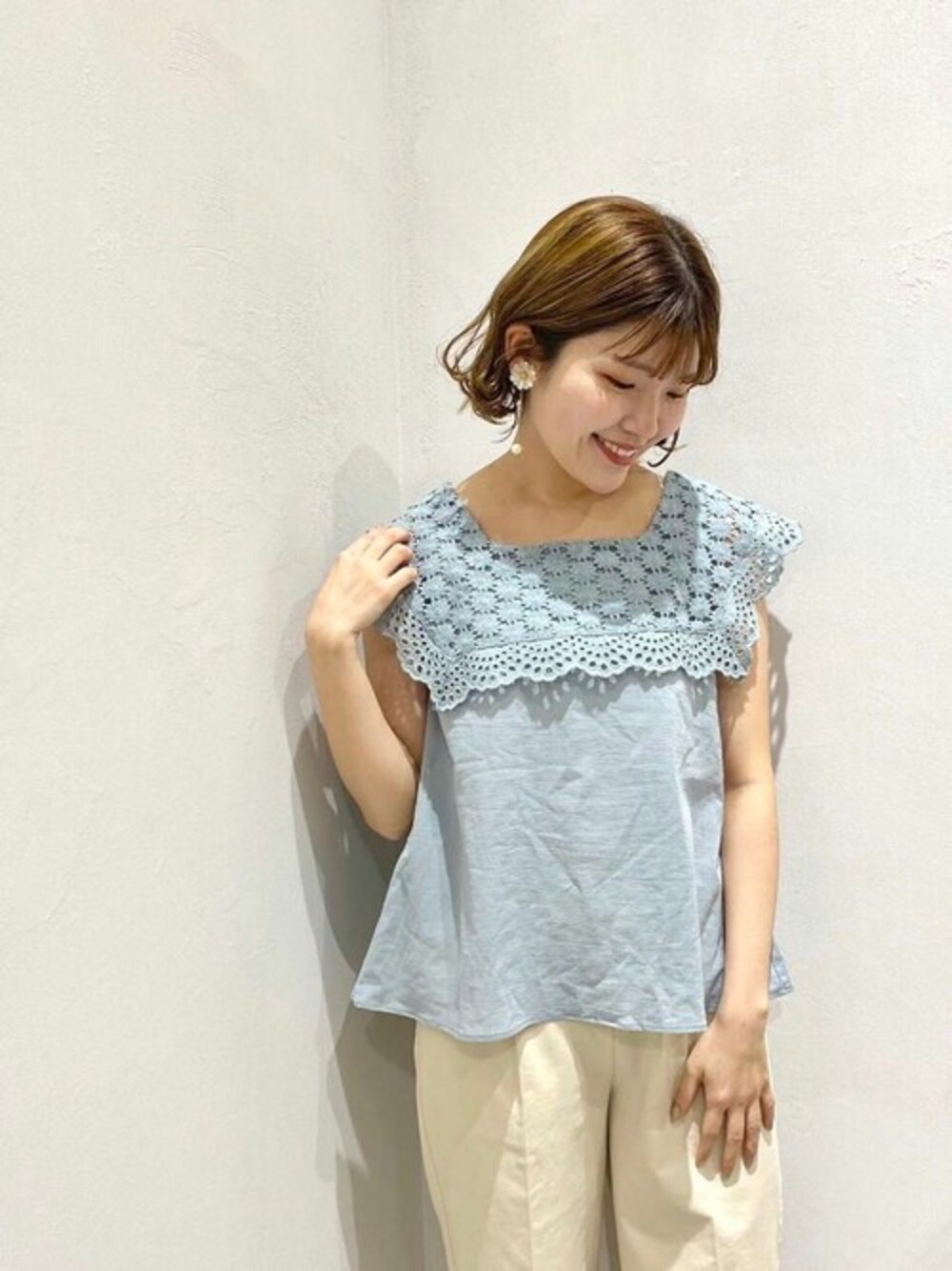 春らしいカラーとお花レースのセーラーカラーがポイントのブラウス♡ ノースリーブですが、肩口までのレースで二の腕が気にならないのも嬉しいポイントです♩ flower横浜店staff yamazaki instagram : @flower_yamazaki