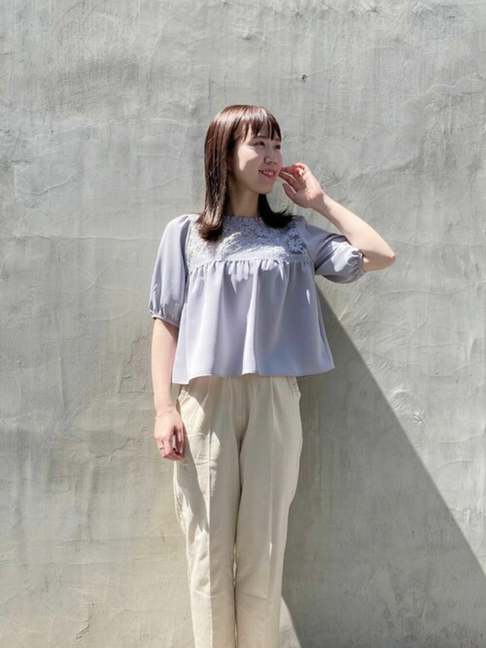 胸元のお花レースの刺繍が立体的で、少し透け感があり flowerらしいブラウス♡ アイボリーのテーパードパンツと合わせて爽やかに♩ flower堀江店staff takeuchi instagram : @flower_takeuchi