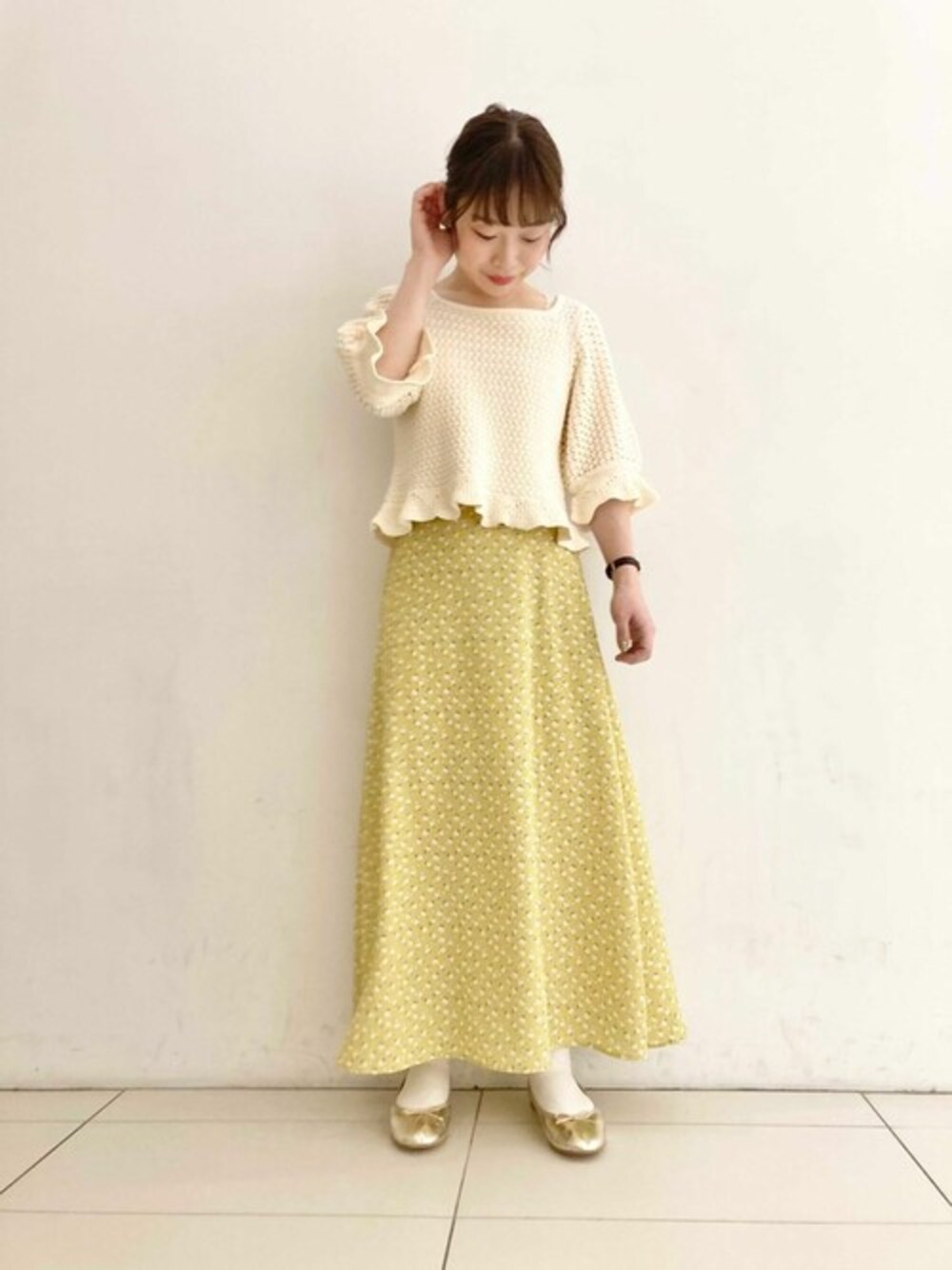 イエローの花柄スカートが華やかな印象に♩ ニットトップスは身頃と袖の編み地を変えて ニットの表情を楽しんでいただけるこだわりのつまった一枚です♡ flowerルクア大阪店staff tokuoka instagram : @flower_tokuoka