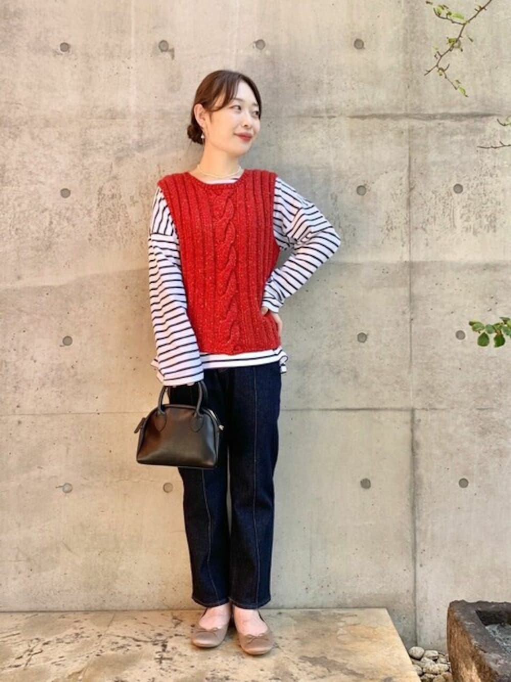 ビビッドなredと太めの網目が可愛いニットベストを 使用したコーディネート♪ デニム×赤、とっても可愛いです! *instagram* flower official @flower_web flower horie @flower_horie_used
