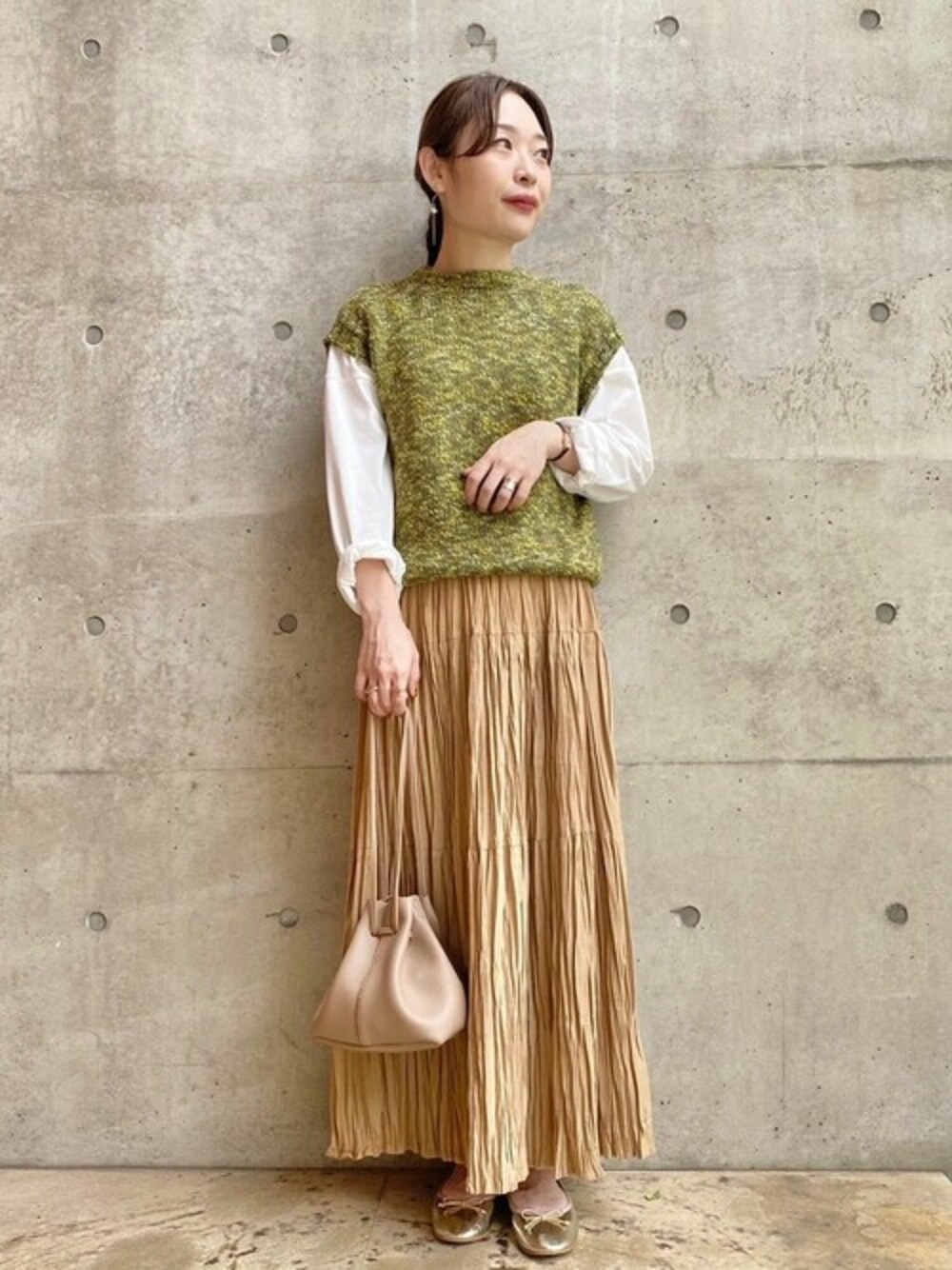 コンパクトなサイズ感と色味が とっても可愛いusedのニットベストを使用したコーデ♪ ロング丈のボトムスとの相性も◎.* *instagram* flower official @flower_web flower horie @flower_horie_used