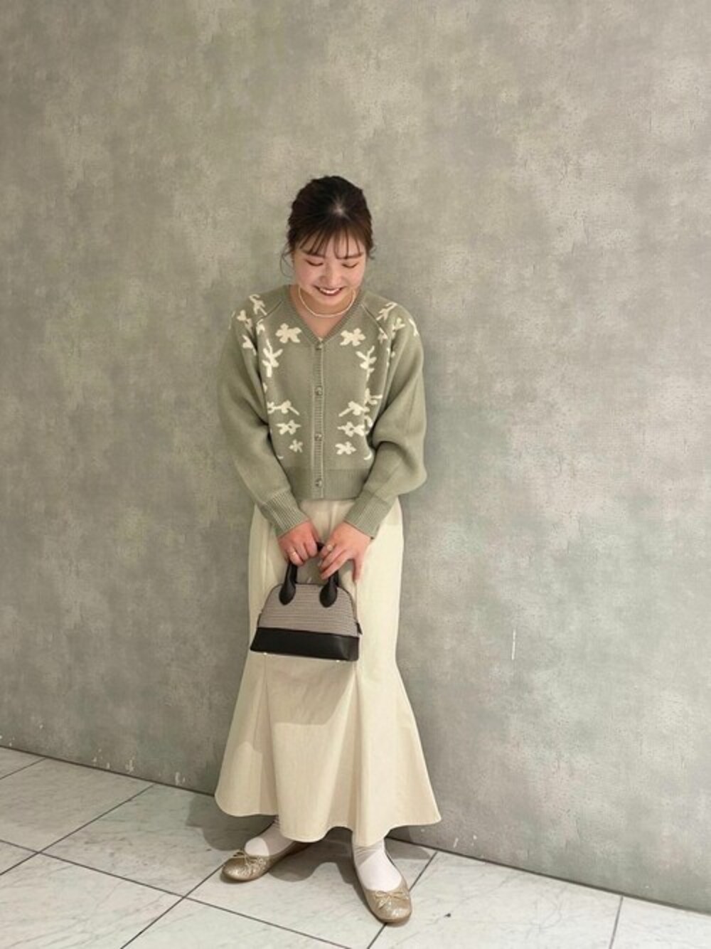 お花が可愛いknit♡ マーメイドスカートと合わせて、 綺麗めコーデにしてみました☺︎♬.*゚ ニュアンスカラーのグリーンが コーデのポイントに❤︎ スカートは小柄さんにもおすすめです☺︎♬.*゚ Instagramフォロー嬉しいです☺︎︎︎︎→@flower_matsukawa *instagram* flower official @flower_web flower osaka @flower_lucua