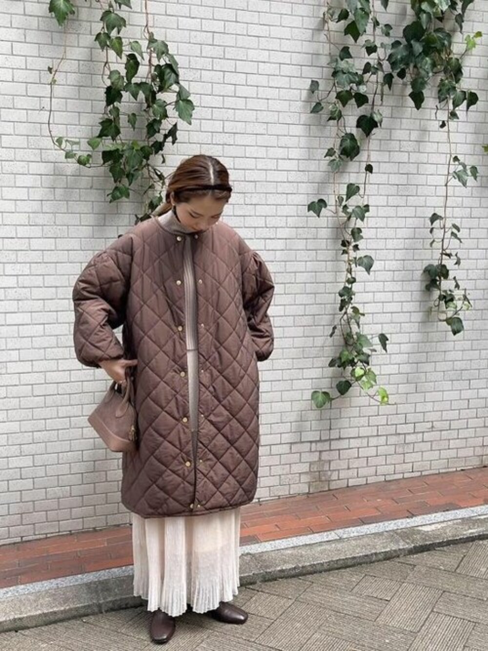 小物をブラウンでまとめた秋コーデ...☕ 長さのあるキルティングコートがあたたかいです♪ *instagram* flower official @flower_web flower shinjuku @flower_shinjuku