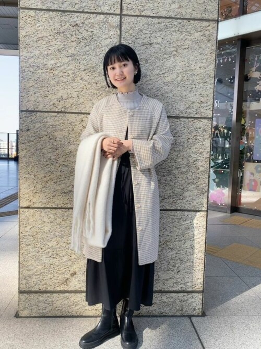 ノーカラーデザインのコートはスッキリした印象に❅ ボリュームのあるマフラーも、 バランス良く合わせていただけます♪ *instagram* flower official @flower_web flower osaka @flower_lucua