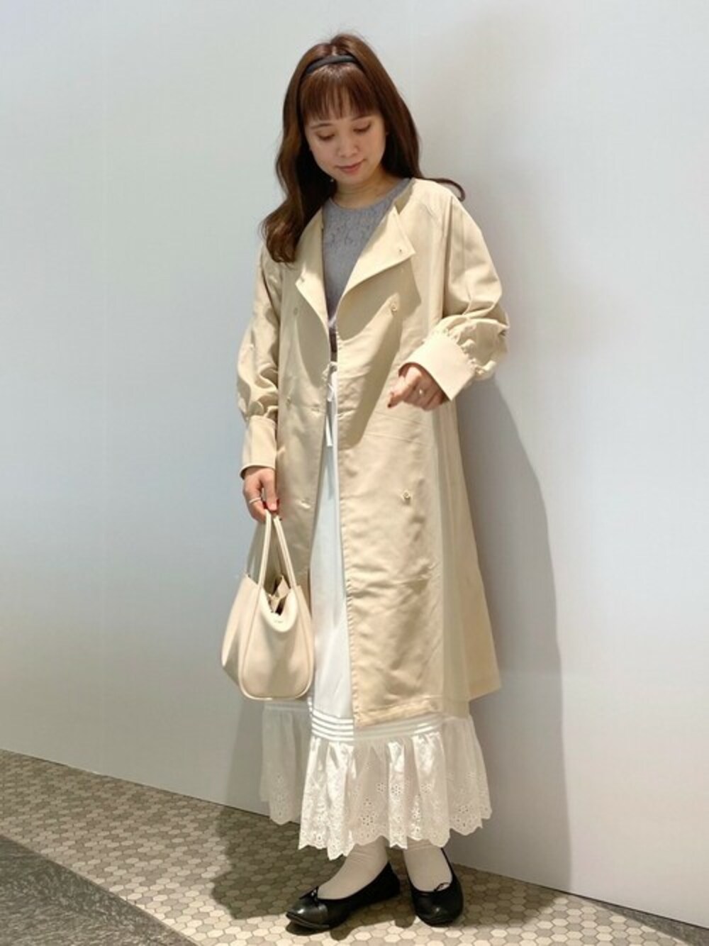 何にでも合わせやすいノーカラートレンチ 𓂃ෆ 羽織るだけで一気に春コーデに ⚘ レーススカートと合わせて 裾から覗かせてもかわいいです .∘ *instagram* flower official @flower_web flower tennojimio @flower_tennojimio