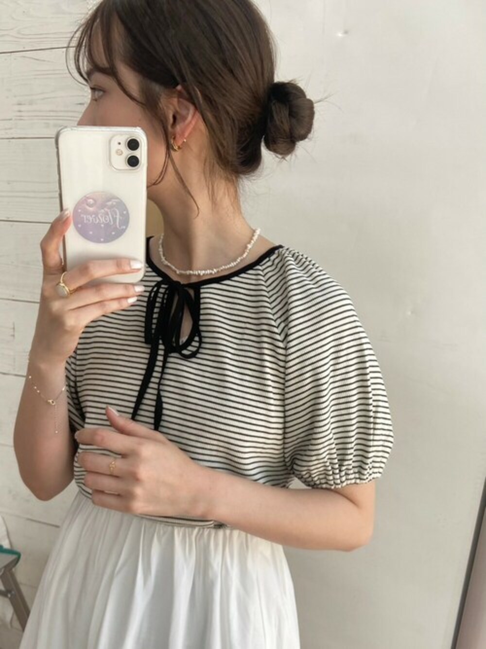flower(flower )のTシャツ/カットソー「ネックリボンボーダーティーズ」を使ったコーディネート