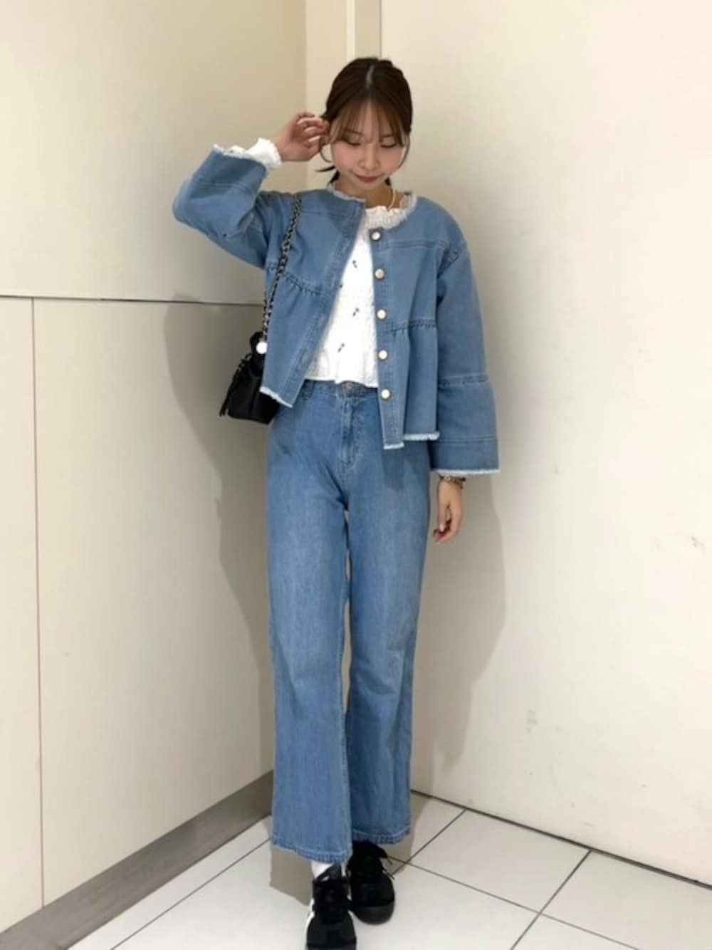 flower(flower )のノーカラージャケット「デニムフレアジャケット」を使ったコーディネート