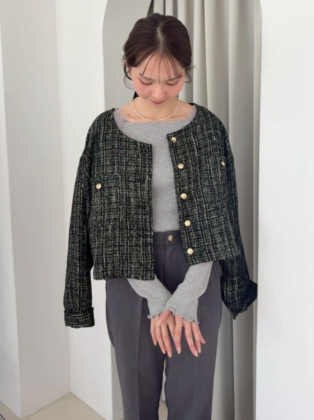 flower(flower )のノーカラージャケット「シャイニーツイードジャケット」を使ったコーディネート