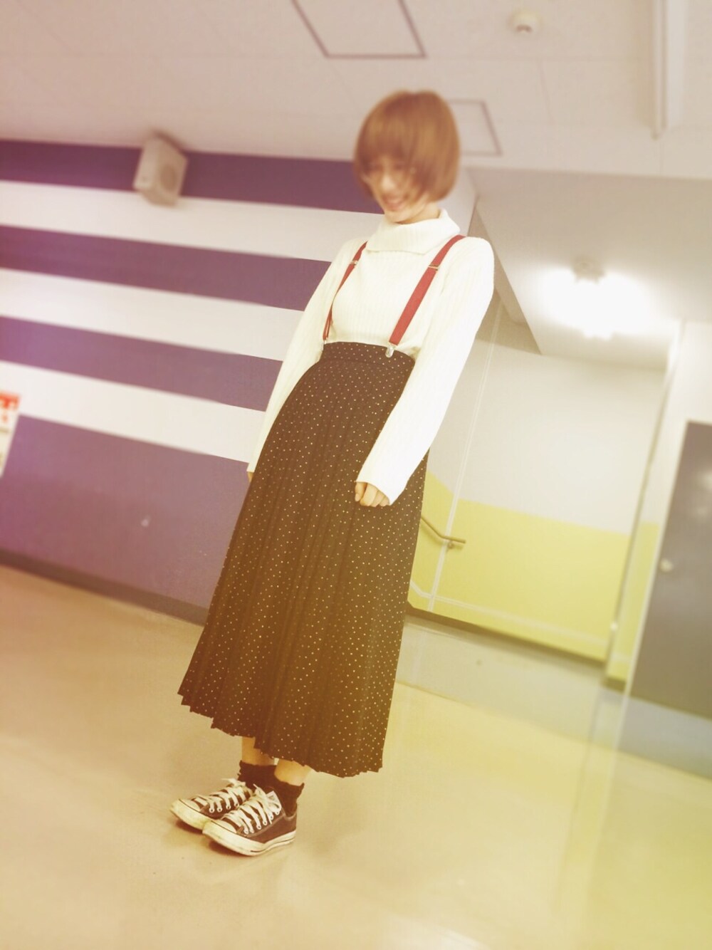Knit:GU Skirt:Grimoire Suspenders:wego Shoes:converse やっとこのスカートはけた😎✨ hitoちゃんと選んだスカート👸💓