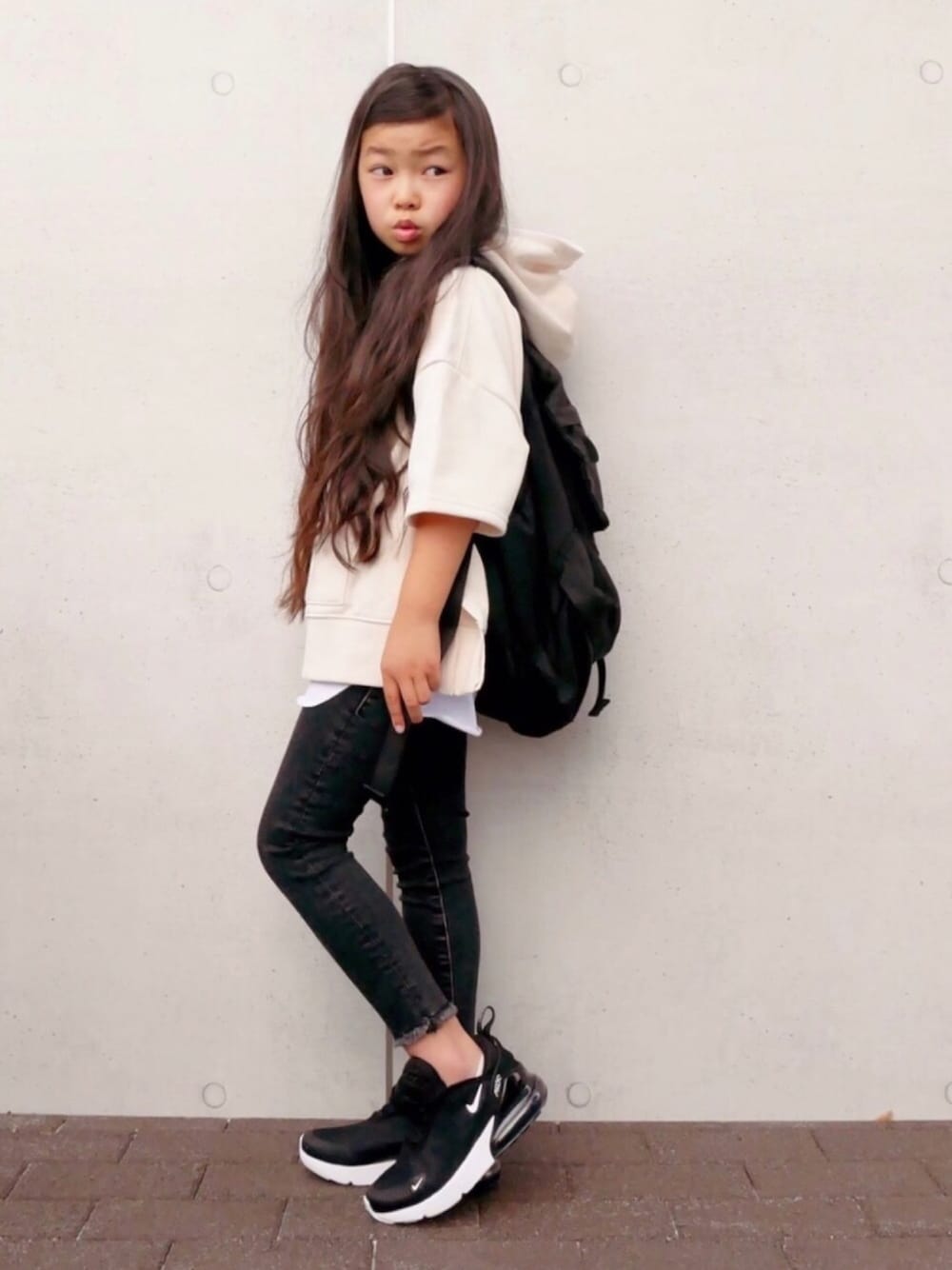 花音のパーカー「キッズサイドスリット バックロゴ入り無地ワイドプルオーバーパーカー(半袖)」を使ったコーディネート