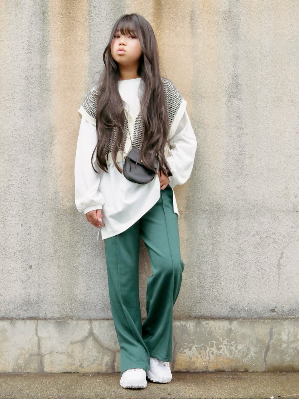 ベスト・トップスsize:140 パンツsize:14 【身長130/体重27】 短丈のニットベストが予想を超えた可愛さだった♡ 肩が落ちたデザインが良いー(*´ω`*) 別々にも着られて◎ 見ていただき、ありがとうございます♪