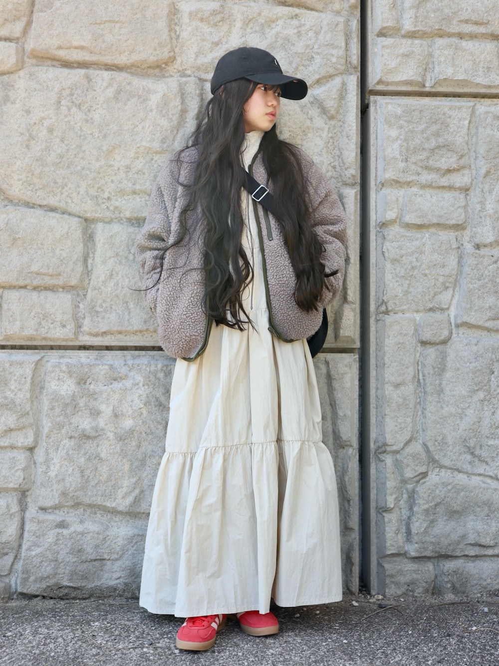 アウターsize:S ワンピースsize:FREE シューズsize:23.0 【身長149/体重41】 春も着られるドッキングティアードワンピース(*´ω`*) リバーシブルのボアブルゾンと。 身長150ほどの花音さんで、 ギリギリ引きずらない丈感。 可愛いよね♡ 見ていただき、ありがとうございます♩