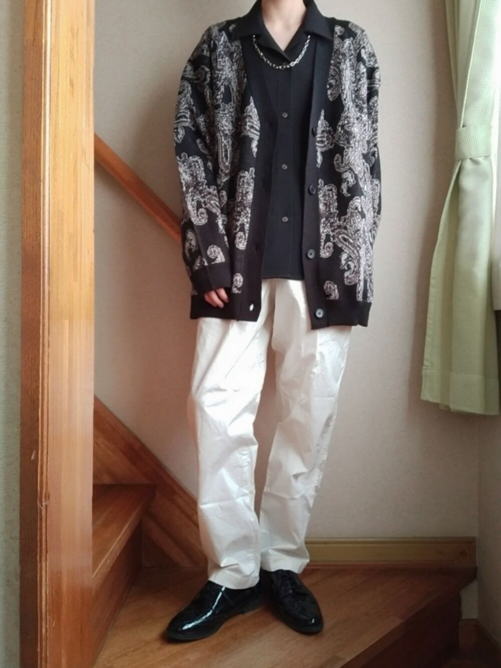 カーディガン×モノトーンコーデ ZOZOでカーディガンを漁っていたら出会ったお品 柄とシルエットが可愛くてポチりました🤭 (ベージュも可愛かった) 普段シンプルな服装が多いので柄が入ると華やかになって良きです