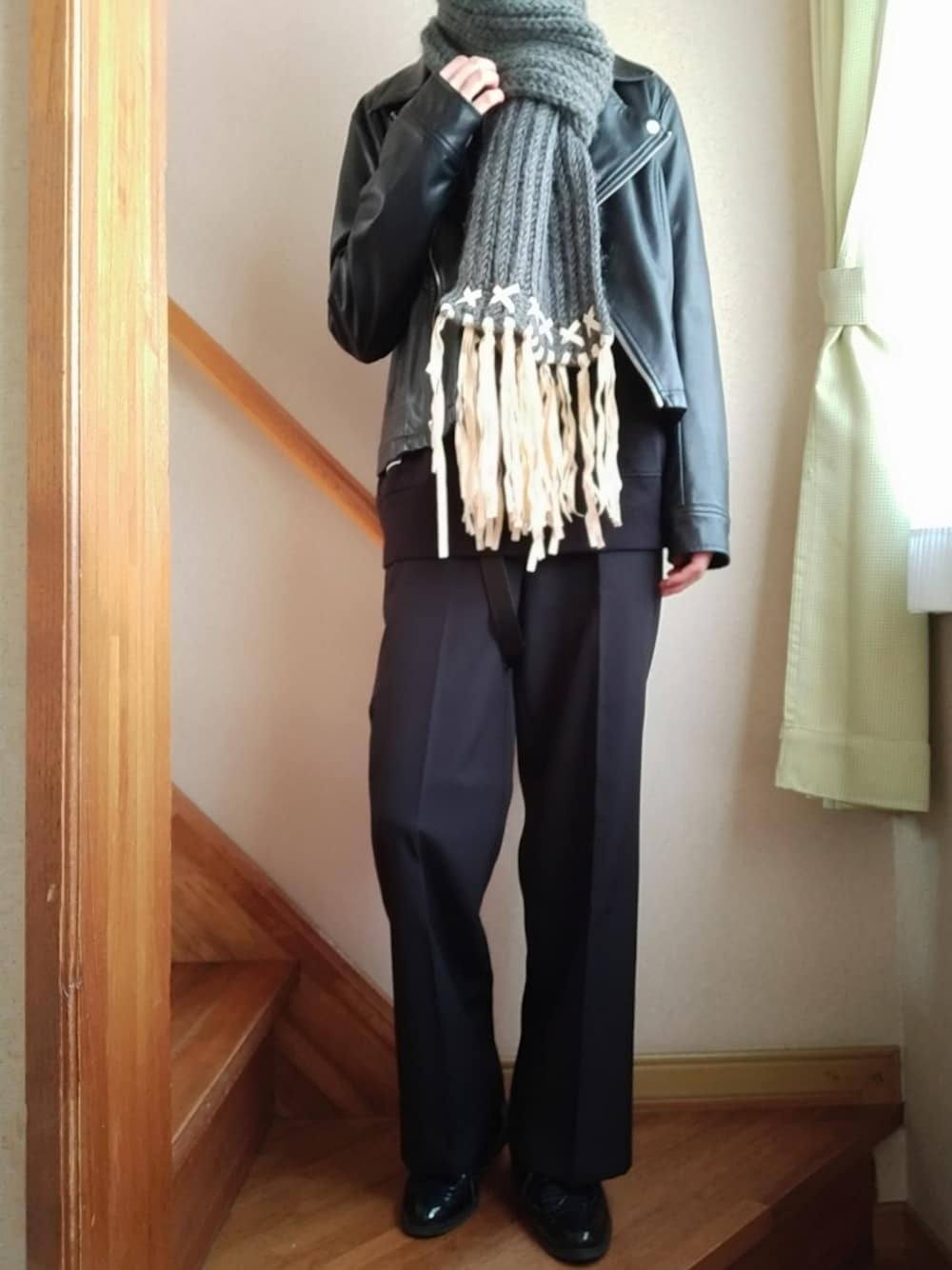 秋のマフラーコーデver.2 いつも閲覧、いいね、お気に入り、フォローなどありがとうございます😊✨ フリンジが特徴的なグレーのマフラーをライダースや他のブラックアイテムで締めて個性がありながらもスタイリッシュなコーデにしてみました( ˙꒳˙ ) シンプルな服装にもってこいのマフラーです✌️
