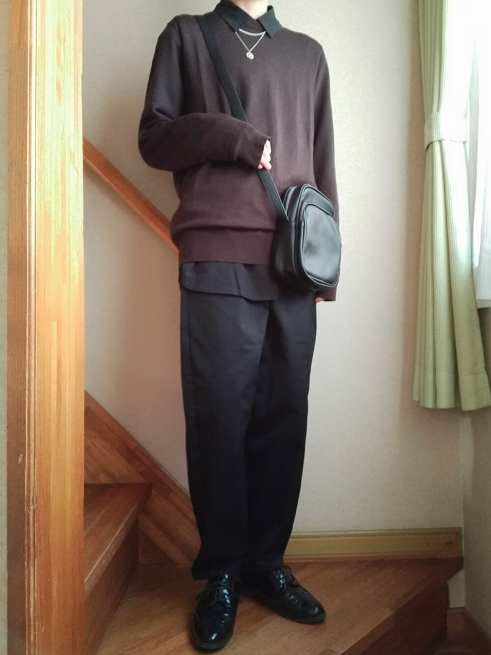 ブラック×ブラウンコーデ いつも閲覧、いいね、お気に入り、フォローなどありがとうございます😊✨ 前にコートのインナーとして着ていたコーデです ダークブラウンがブラックとマッチして統一感があって好きです✌️