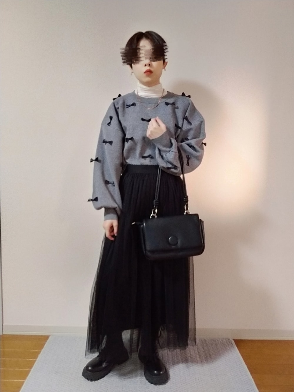 夏に買ったのに全然使えていなかったチュールスカートをこの秋は使っていきたい!笑 大人っぽく着たかったのでモノトーンで合わせました🦓 リボンが散りばめられたトップスもお気に入り🎀