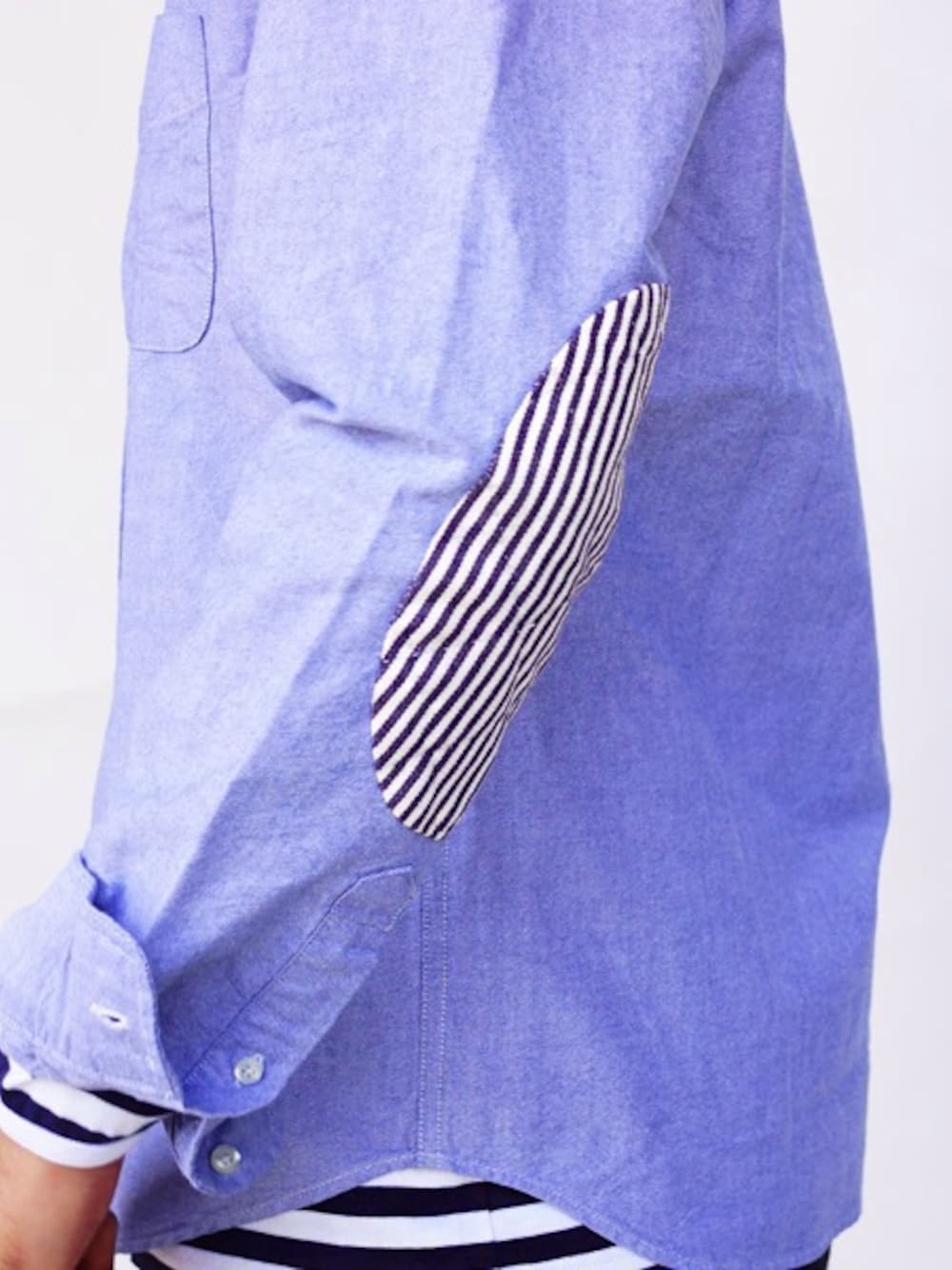 春らしいサックスブルーのオックスフォード・ボタンダウン・シャツに、ヒッコリーストライプのエルボーパッチ(肘当て)をキルティングしました♪ うまくトラッドなシャツをカジュアルダウンできたと思います☆