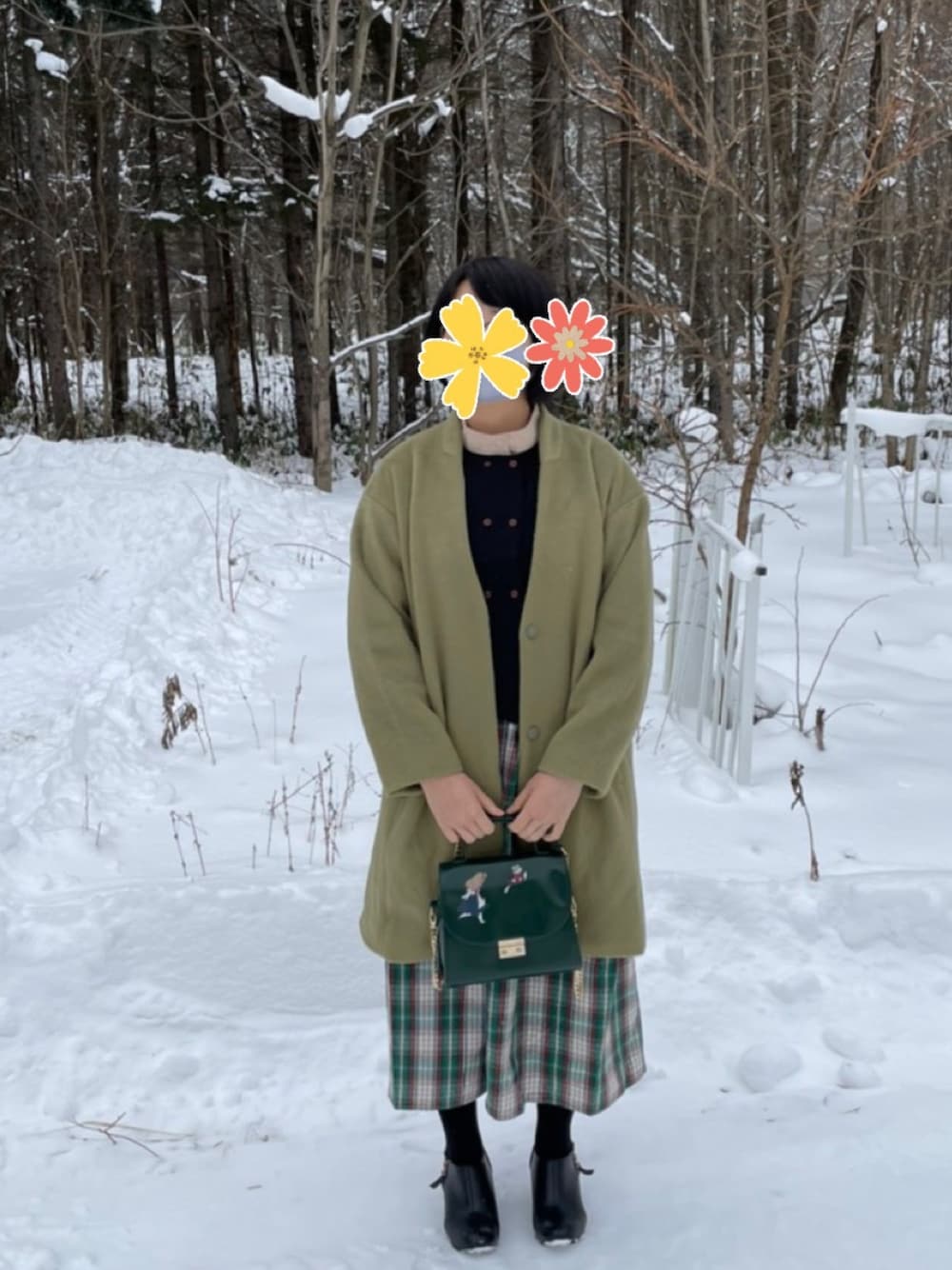 最近購入したベストを着用* アウターを着用していると 緑!って感じだけど 脱ぐとブラウスの袖が膨らんでいて可愛い