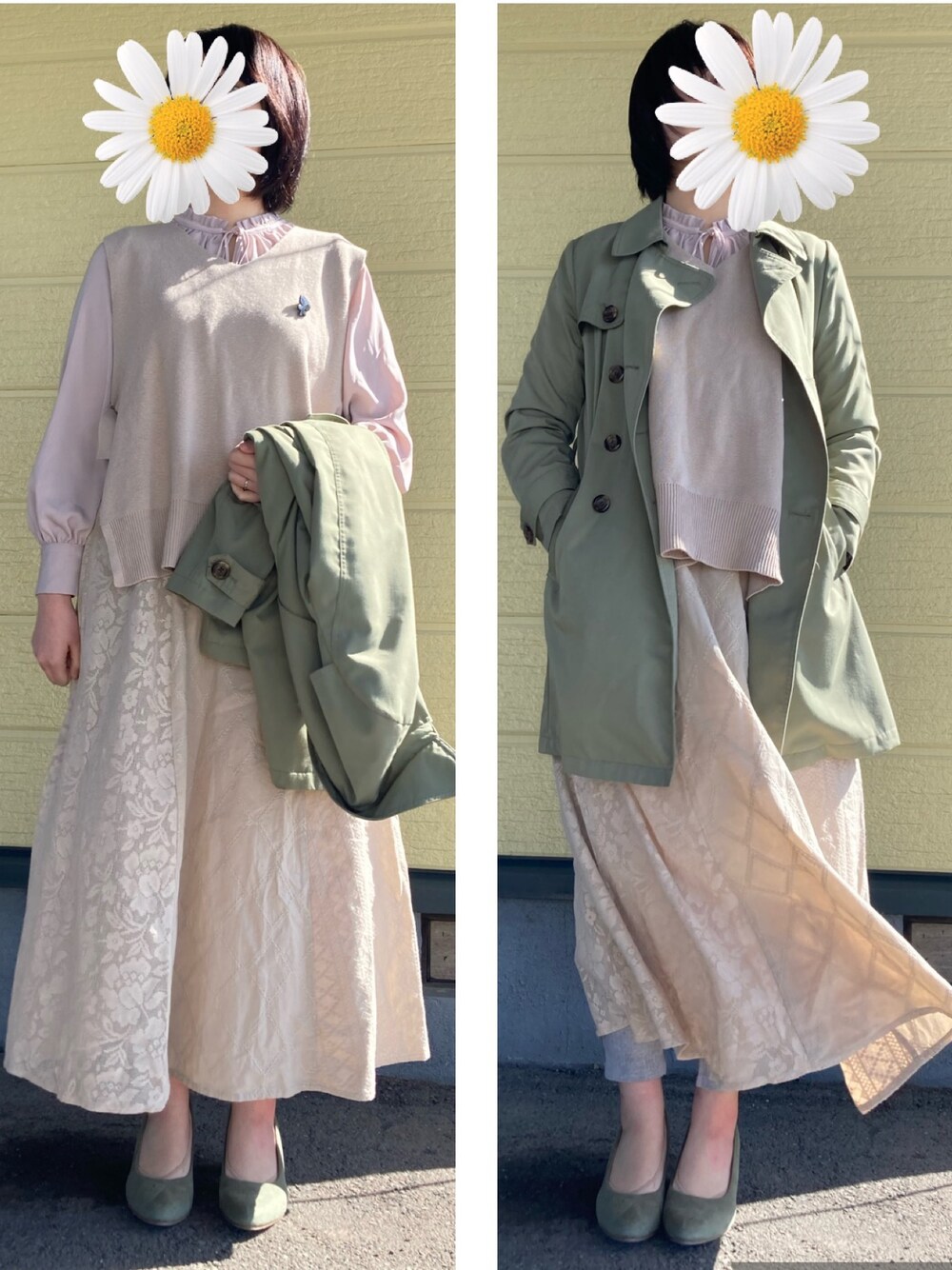 ベージュ×グリーン* 全身ワントーンで揃えてワンピース風に 色んな素材を組み合わせることが出来るから、ワンピースとは違う感じがする うきうき春気分🎶