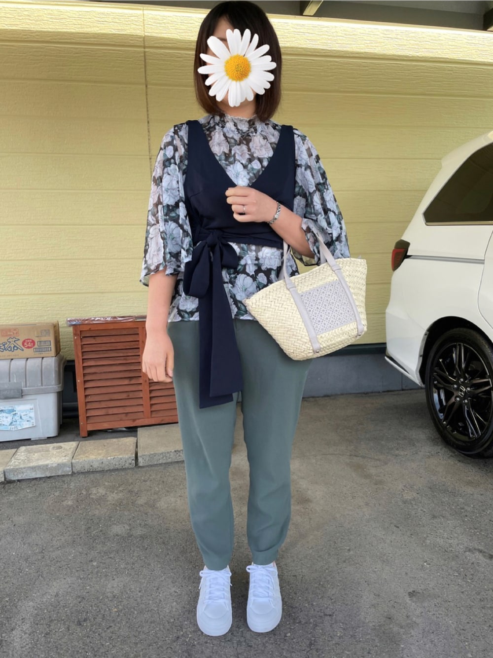 同系色* シースルーの花柄ブラウスに、 揺れるリボンのビスチェ ブラウスの袖がフレアで二の腕隠しにも笑 ずっと欲しかった白一色のスニーカーが 安くなっていて即買い! どの色合いのコーデにも合わせやすいからヘビロテ間違いなし!
