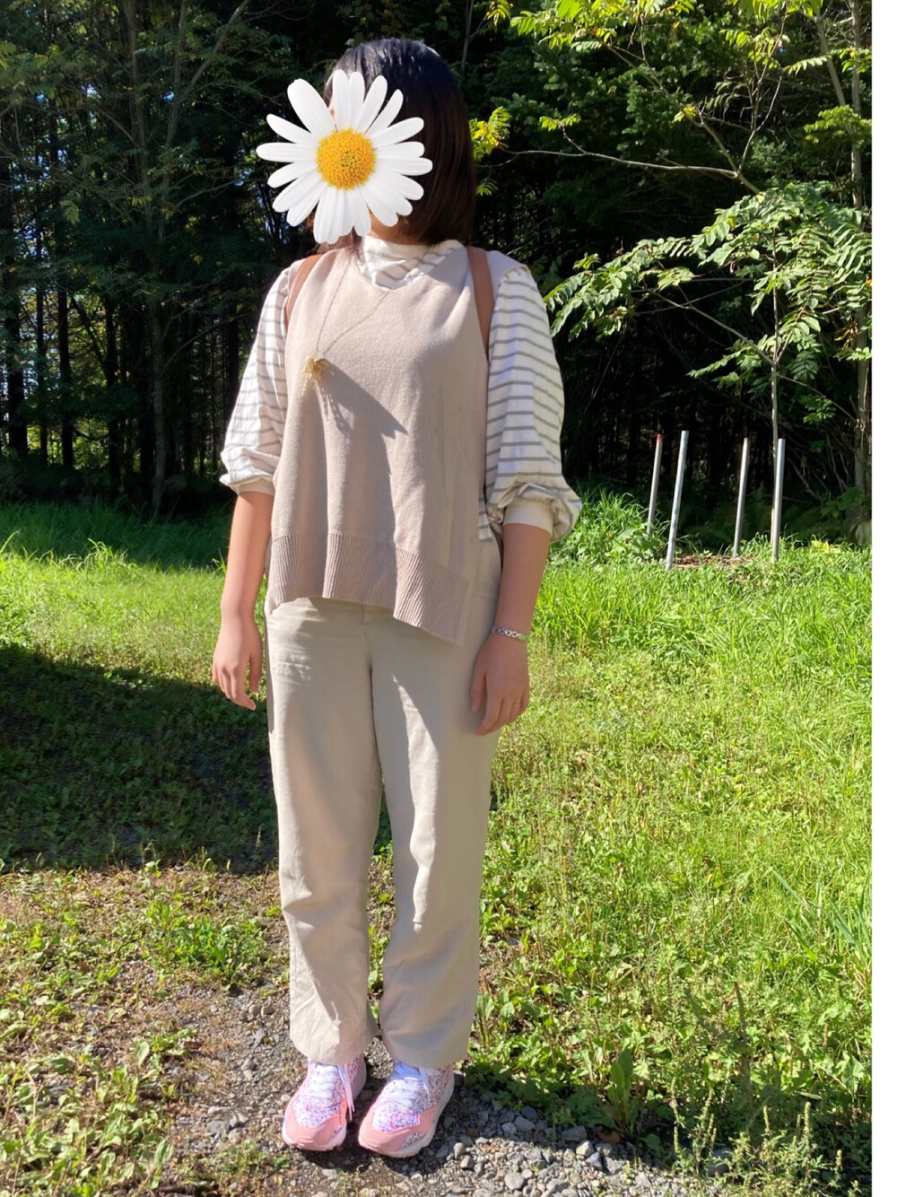 暖かい秋 全身ナチュラルベージュ系で 足元は差し色のピンクを* 今日はアウターなしで 全然寒くない こんな日は今日限り、かな? リネンパンツも着納め、かな?