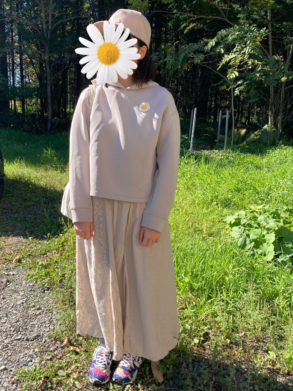 ベージュで統一* 足元だけ派手にして、 あとは統一感を出しました 目玉焼きのブローチをワンポイントに ゆるっとお出かけコーディネート*