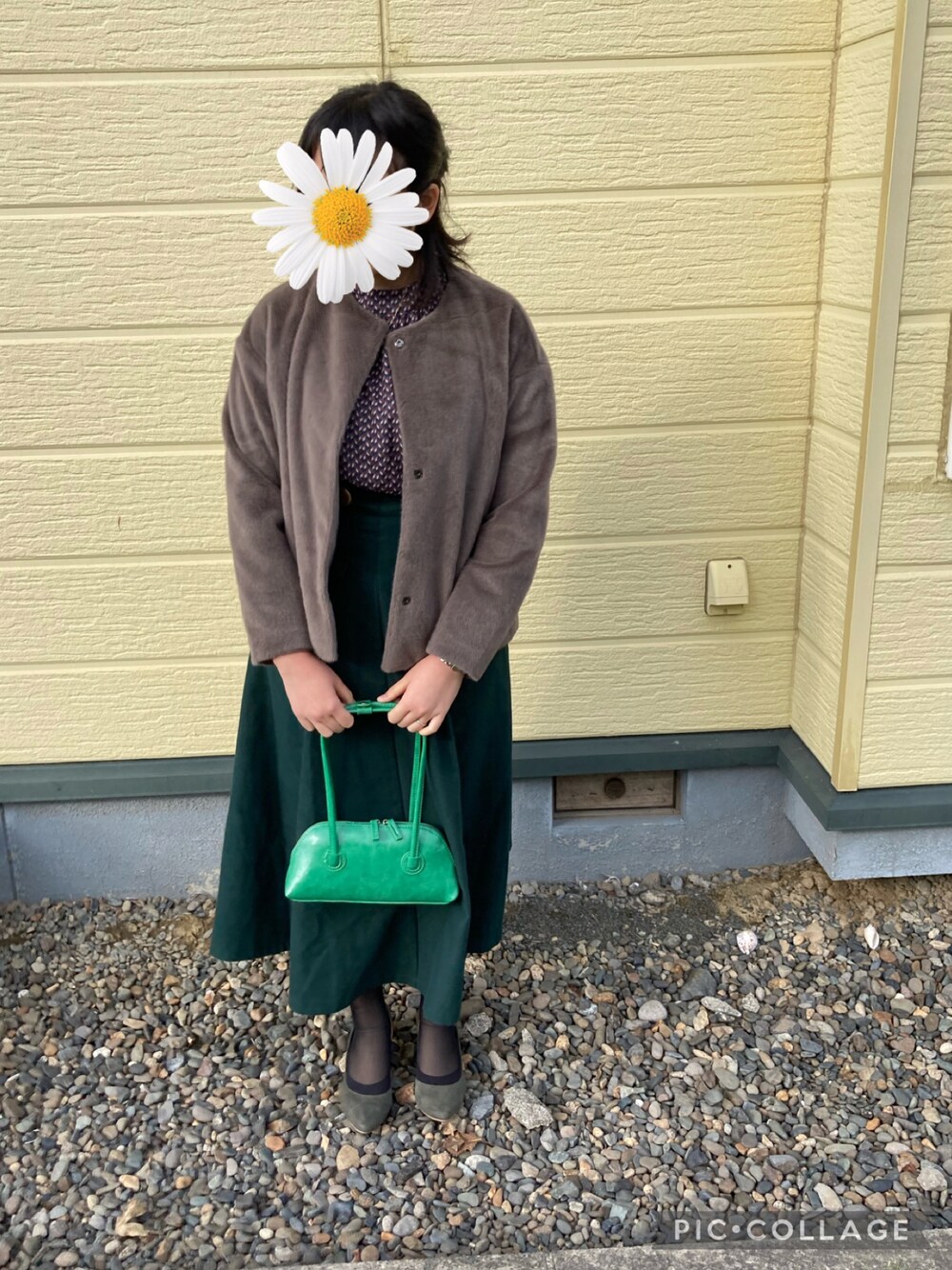 ふわふわのスムースヤンジャケットと 形の綺麗なカッティングスカートで お出かけコーデ* ブラウスの幾何学模様をアクセントに あとは無地 温かい素材にこだわりました ブラウン×グリーンの組み合わせ