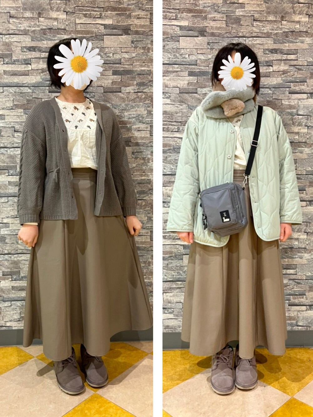 チャコール系で優しい雰囲気を* キルティング×刺繍のブラウスが ポイントになっていて可愛い エコレザーのスカートの中はタイツを履いて、暖かさup!