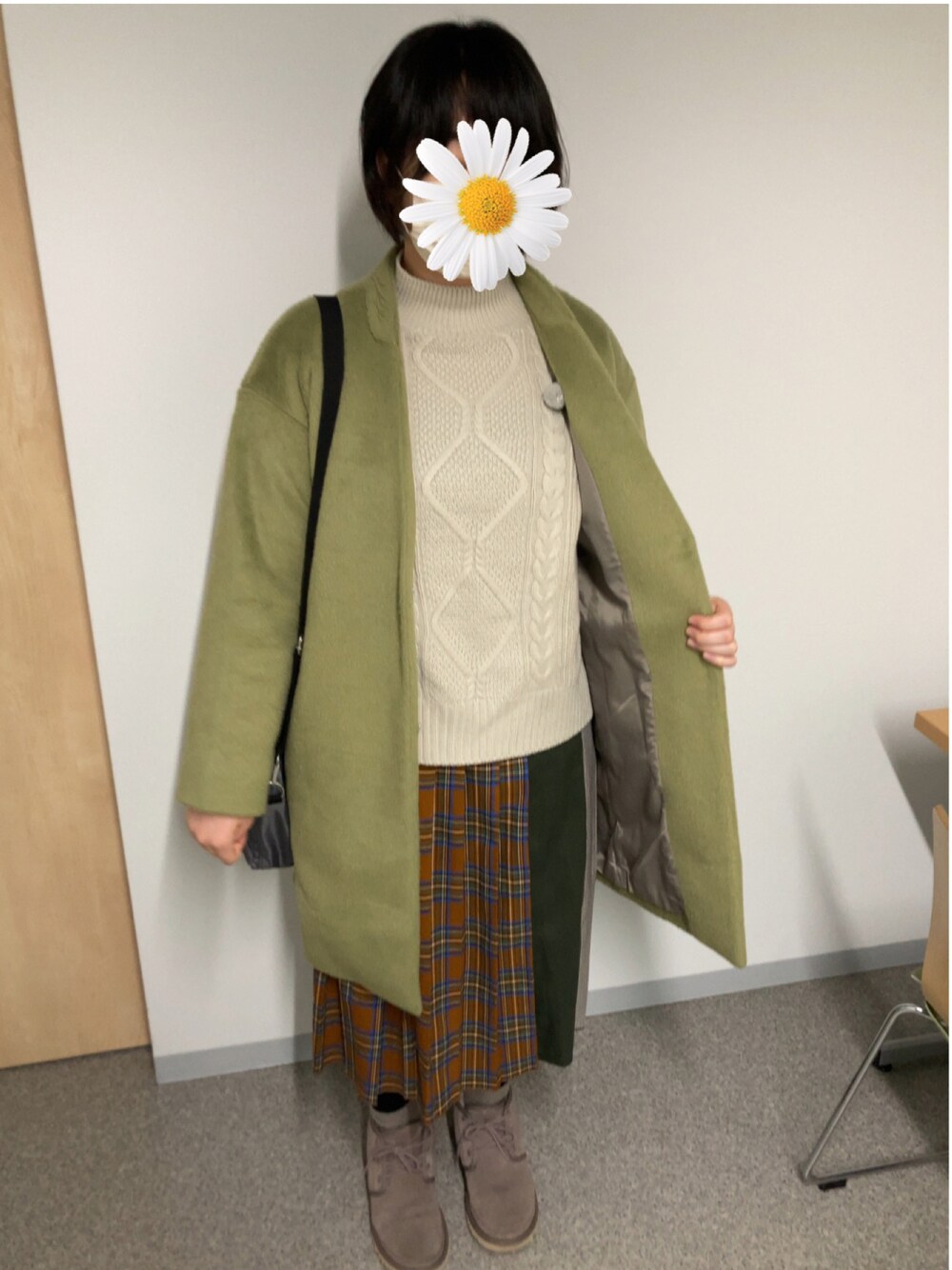 プリーツとコートで縦ライン強調* 素材が暖かいけれど、色味からも暖かく 本日も タイツ×靴下×ブーツの3点セット まだまだ 寒い日は続くからこそ、もこもこはやめられない!