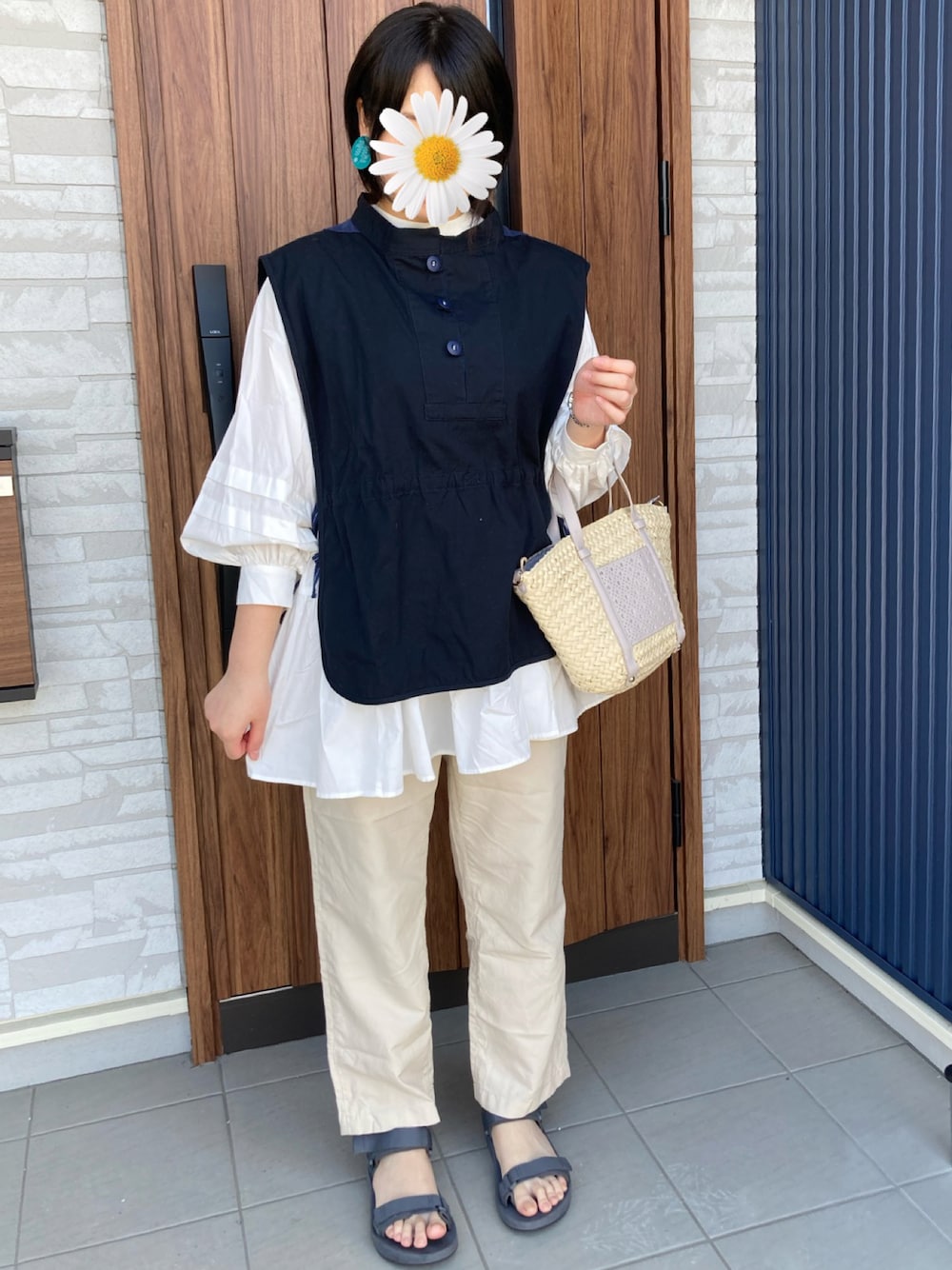 白ブラウスやリネン素材のパンツ、足元はサンダルで涼しさup この時期のかごバッグは外せない♬︎