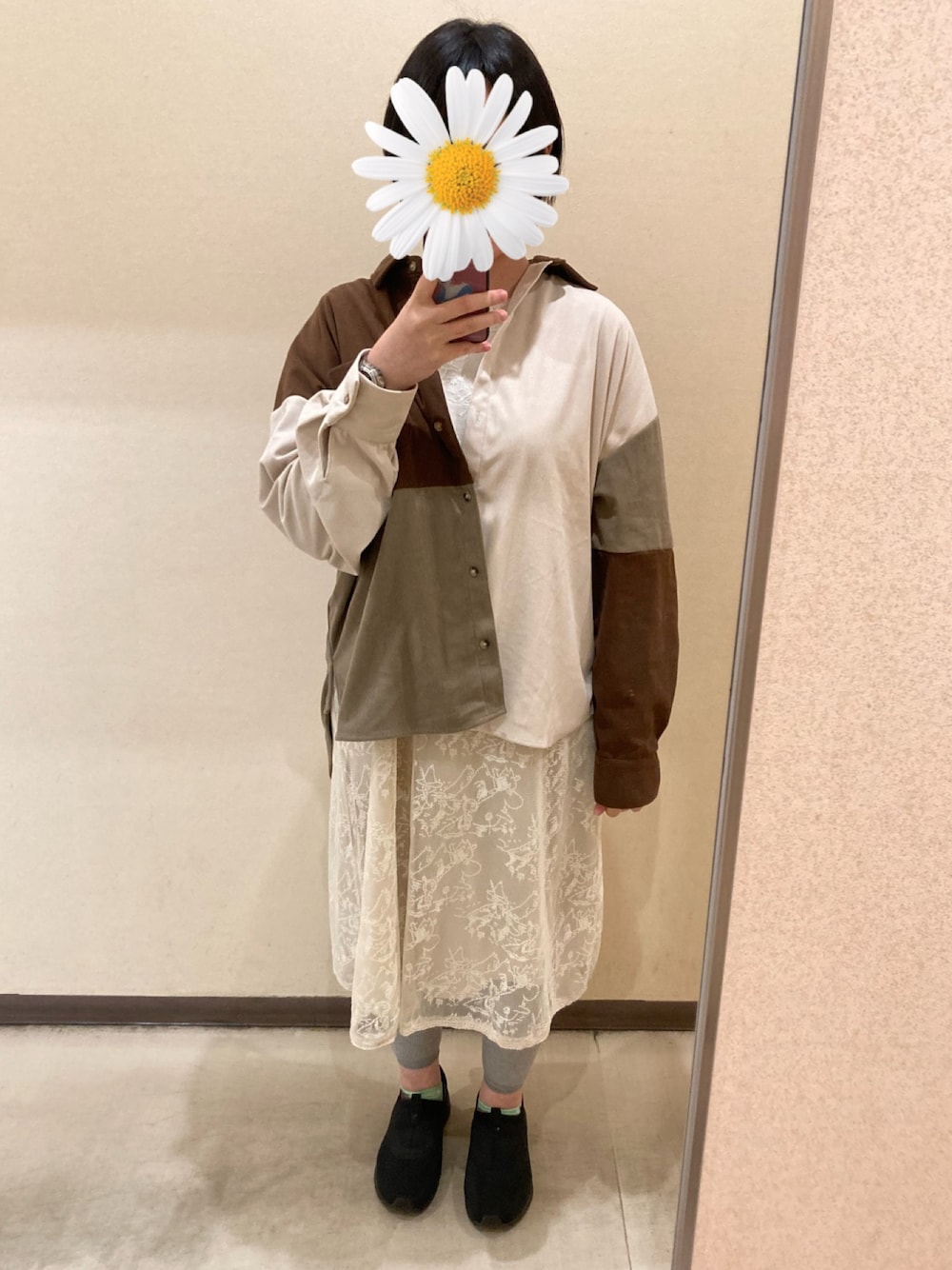 肌寒くなってきましたね ムーミンの刺繍ワンピースにコーデュロイシャツを羽織って、落ち着いた秋コーデ* ベージュやカーキが着たくなる季節🎶