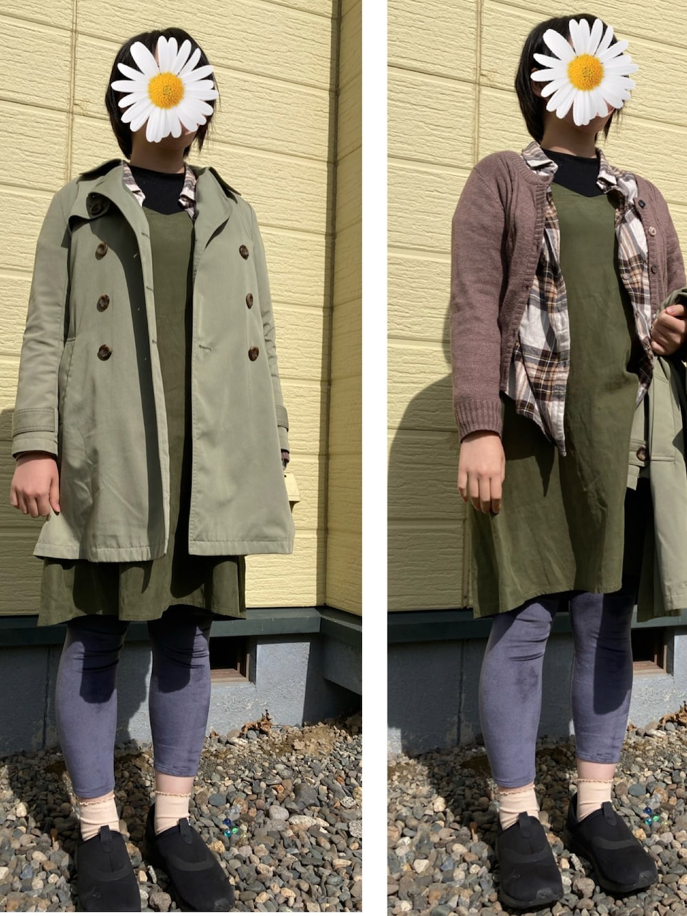 グリーン×ブラウン* 肌寒すぎて、 モックネックのローゲージニットに カーキのワンピース その上からチェックシャツで さらにブラウンのカーディガンと用意周到 重ね着してるけど、落ち着いた色味で合わせて統一感を🎶
