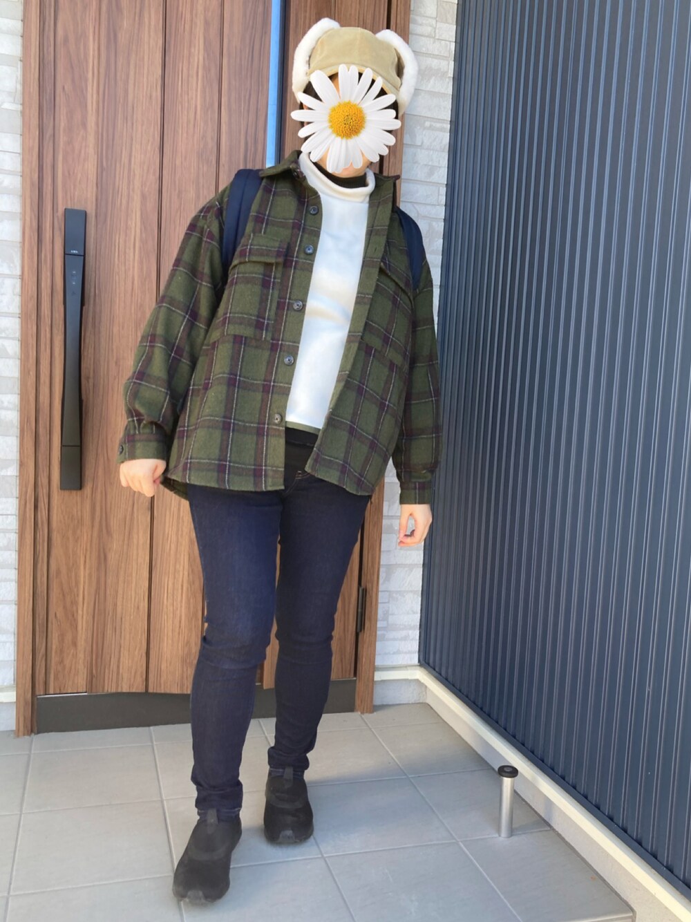 ほぼUNIQLO* 色味を緑で統一 フリースの下にも緑ニットがチラ見え